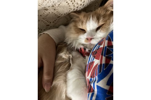 毛色は茶色とホワイトの2色です。もふもふの長毛でいつもちょこんと可愛い子猫です♪めちゃめちゃ可愛くて長毛が凄い良い子です。ただ出産時は尻尾はあったのですが母猫がやらかしました。短い尻尾になりましたがそこがまた可愛い。父方の祖父及び曽祖父がチャンピオン。母方の曽祖父がチャンピオン。